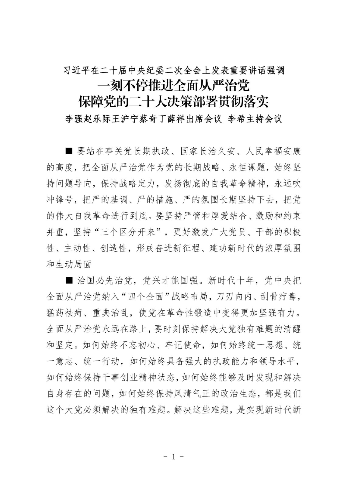 習近平在二十屆中央紀委二次全會上發表重要講話強調一刻不停推進全面從嚴治黨保障黨的二十大決策部署貫徹落實